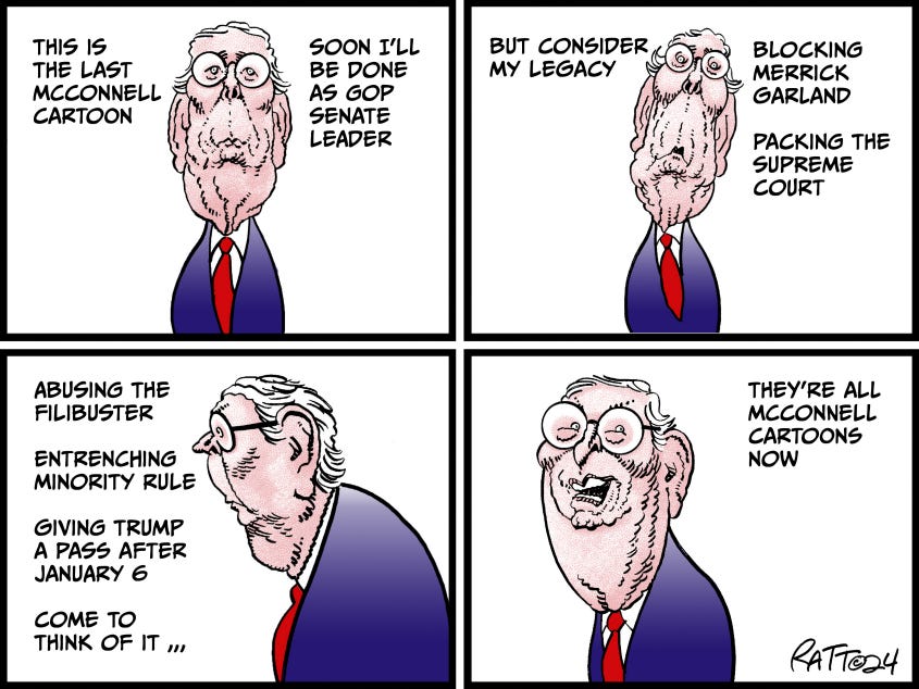 Actually, Paul, I think you are being inordinately critical of the honorable Senator from Kentucky. History will show that in his principled stand against the sleazy nomination of Merrick Garland to the SCOTUS the "Murder Turtle" saved our Republic from a disastrous pick for a Supreme Court Justice as his craven performance as Attorney General to Joe "Auto-Pen" Biden has conclusively shown. I realize it is extremely difficult to prove a "what might have been" but based on Garland's DoJ blatantly persecuting God-fearing, law-abiding Americans in the name of political vendettas during Sleepy Joe's administration he had no business getting a lifetime appointment to the SCOTUS. Almost single-handedly, Senator McConnell preserved our civil liberties. V/R Doc B