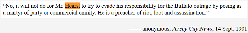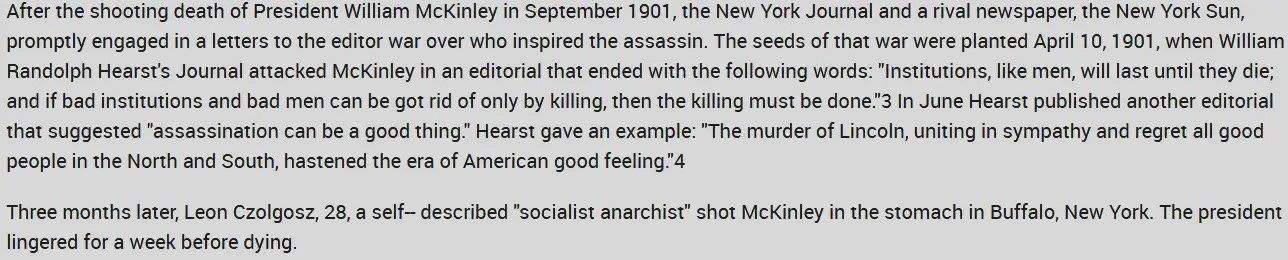 The Yellow Journalism era of the late 1890s was little different from what I am discussing here today and produced as much chaos and as many allege, the assassination of President McKinley. In those days, wealthy publishers, William Randolf Hearst and Joseph Pulitzer were engaged in a brutal contest for readership, because like today, it drove advertising revenue. There is a strong case to be made historically, that it was their sensationalist, dishonest alleged news, resulted in the Spanish American War. Hearst’s paper, put into print an article that said that President McKinley should be shot and sure enough, not long afterwards, he was assassinated.