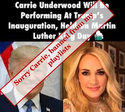 I refuse to watch the inauguration ceremony any further than seeing with my own eyes just how much smaller his crowd will be than for any other POTUS of any party. Due to singing at Trump’s inauguration, Carrie Underwood has now been removed from any of my playlists. I feel the same about anyone supporting anything regarding MAGA. They are complicit in the destruction of our republic, by supporting him. As I like to say, “I will continue to work towards forgiving family and close friends, but I will never forget.”