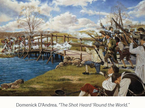 Well, my fellow citizens who like me, will be in the streets this Saturday, April 19th, protesting the fascist version of the Republican Party, our motivations are actually grounded in our real history. This weekend is even more historically inspiring to real patriots than the far-right’s fake patriotic inspirations. April 19th, 1775, was the “shot heard round the world,” or in plain speak, the first battle between organized colonists, standing their ground against British troops advancing to enforce King George the III’s oppressive policies over them. The colonies had lost their patience to be treated as equal subjects of Britain and that historic shot across the bow at the advancing troops from Minutemen on that bridge in Concord, Massachusetts, became that shot heard round the world.