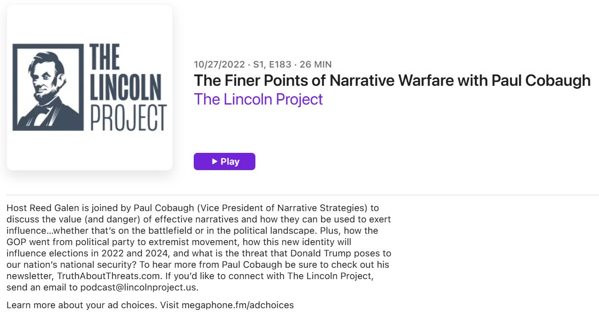 Understanding the identity of audiences is the heart and soul of Narrative Warfare. Social media provides ample opportunity to better understand those identities, both friendly and adversarial. To be blunt, so long as Trump and MAGA control the entire GOP, it is the enemy of American values. Many who vote for the MAGA GOP truly believe themselves patriots, but that doesn’t matter so long as they put the enemies of true American values in office, where they can continue to further degrade our republic.