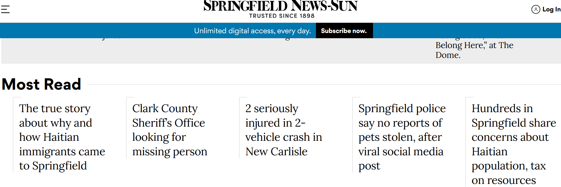 It just so happened that I was in Springfield just a couple of days after, the great, “Haitians eating pets” fiasco by Trump and JD Vance, who is also from near Springfield. Talking with locals in both Springfield and Urbana about their unwanted Trumpian notoriety, was beyond humiliating for them. Without exception, every person I ran into was humiliated, embarrassed by and scornful of Trump and Vance’s insanely dishonest conspiracy theories regarding local pets. There is more good news on the Trump/ Vance issue later, or maybe even tomorrow, time-permitting. For those interested, the local paper, The Springfield News-Sun has run an exhaustive and excellent series of articles, explaining the full spectrum of issues surrounding the tragically laughable conspiracy theories.