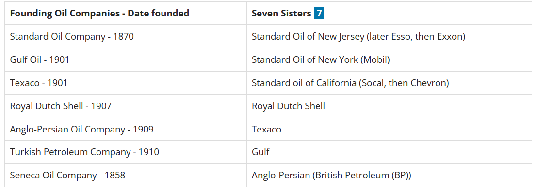 As we can see from the history lesson above, big oil has been largely dominated by the same trusts, entities and corporations from the very beginning. In the chart below from the LOC/ Library of Congress, the big entities, often called the Seven Sisters had all been formed by 1910 and today, are more powerful than any other global, industrial monopoly.