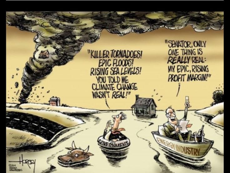 Now… let’s finally get around to talking big oil and the burdens placed on every American taxpayer and billions of others, suffering from Climate Change around the world. Yes, you and I pay taxes for oligarchs to become wealthier and more powerful.