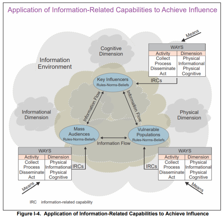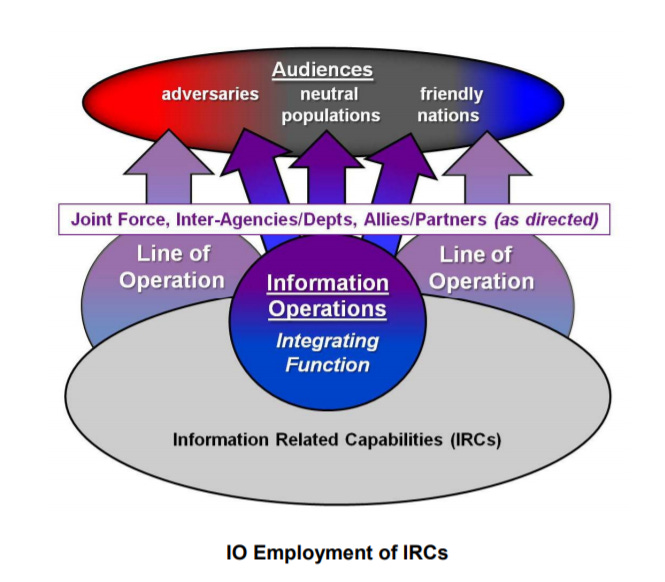 IO, the acronym for Information Operations which is evolving into IW, Information Warfare doctrinally is primarily where influence is nested at DoD. It is part of operations and its mission, architecture etc. is laid out in JOINT PUB, 3-13. Although this publication is being re-written, here’s the DoD definition of record; “the integrated employment, during military operations, of information-related capabilities in concert with other lines of operation to influence, disrupt, corrupt, or usurp the decision making of adversaries and potential adversaries while protecting our own”.