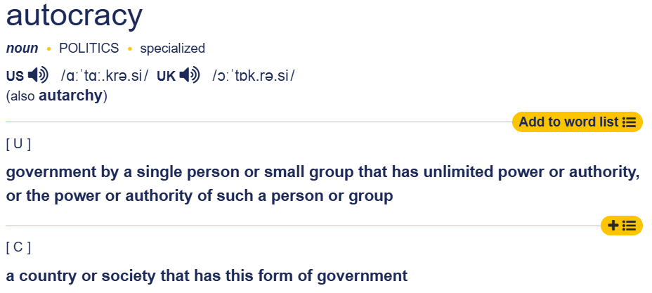 In this section, first we have the Cambridge dictionary definition of autocracy. After that comes several linked credible news stories and underneath each, are excerpts which are quoted. This makes it quite clear that Trump, supported fully by MAGA both desires unlimited and unchecked power so as to emulate his heroes, from Putin, to KJU, Xi, Hitler etc. There is no good argument to suggest that he would not do all possible to achieve such power, if reelected. Project 2025 and the 2024 GOP Platform, which mirrors much of P25 are oriented to supply him the power to do so. They are in fact, both plans to do so.