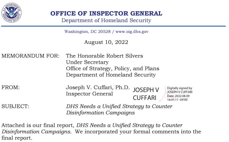Eight weeks ago, the Dept. of Homeland Security, Office of the Inspector General, issued the results of their audit of DHS and their mandated task of protecting the nation from mis and disinformation. The result was both blunt and spot on.