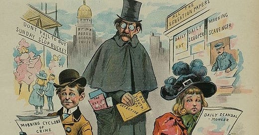 “Print shows a bespectacled man wearing a top hat and over coat, holding a book titled "Old Sleuth the Detective", standing on the street where young children are reading the newspapers labeled "Daily Scandal Monger", "Morning Cyclone of Crime", "Daily Rot, Daily Scooper, [and] Morning Scavenger", and newsstands are labeled "All the Sensation Papers" and "Don't Fail to Buy the Sunday Slop Bucket", with headlines such as "How to Poison a Whole City", "Murder", and "Crime".”