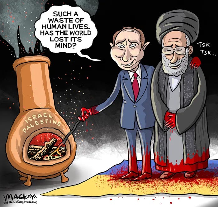 Russia has pointed the evil Iranian theocrats at Israel, largely as a payback to Bibi Netanyahu for not toeing his line on Ukraine. Bibi has long courted Russian markets for a variety of products, including technology. Nations like India and the now expanding BRICS block do bow to Putin’s coercion and refuse to speak against Putin’s genocidal invasion of his sovereign Ukrainian neighbors. For the record, this is just one of the UN’s dysfunctional attributes that lead to their inability to take many of the steps necessary to curtail the very thing that they were created to do… drive stability and peace.