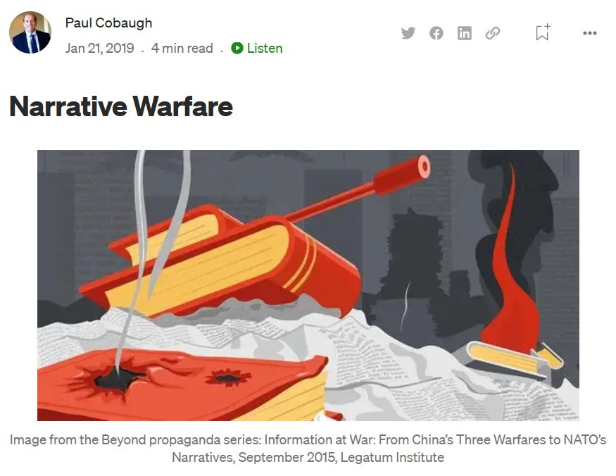 War, competition, conflict etc. is not solely about weapons, logistics and so many other quantifiable qualities. What the military calls, “will to fight” is actually the generator that provides the power to all else. A large part of will to fight is also defined as resilience, especially when on defense. All of this is bound up in the specialty of our think/ do tank, Narrative Strategies. It’s how, with proper understanding of narrative principles, understanding yours and your enemy’s identity determines actions, inactions, resilience, will to fight and much more. We call this, Narrative Warfare. Think of it this way; you can predictably determine how a person will act, react or otherwise (often subconsciously) if you know them exceptionally well, like a spouse, sibling, close family and friends.