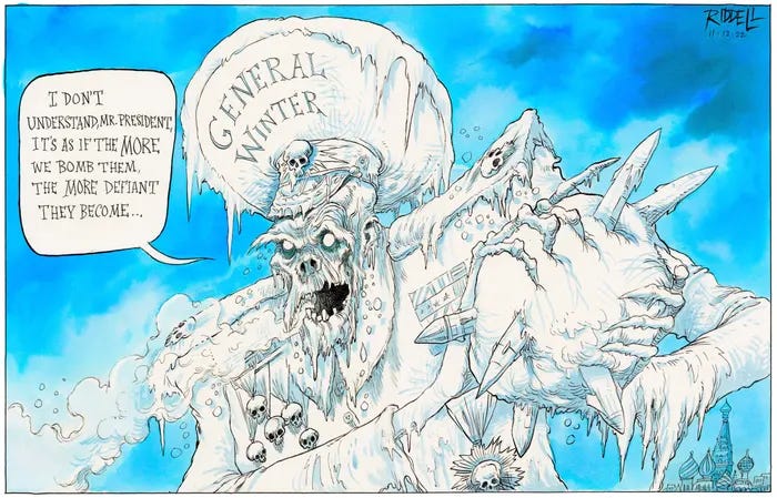 In Ukraine, it’s Putin who is the cruel aggressor. In my professional opinion, this indicates that like last winter, the winter of 2023/ 2024 will see General Winter coming to Ukraine’s aid. The US and NATO must capitalize on this subtle but powerful narrative by kicking the obstructionists in the US House of Representatives, until they provide whatever Ukraine requires to win.