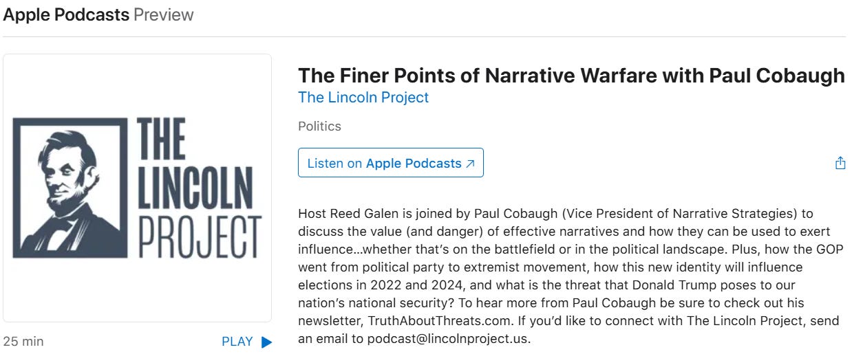 If you’re on the way home from a long holiday weekend, doing chores in the yard or whatever else, this is my relatively short podcast with the Lincoln Project, recorded prior to the 2022, Midterm elections. Our 2024 election situation is even more dire, and it is important as a motivational tool, to know what we’re up against, between the ears of GOP voters. We don’t have to protect ourselves from them because they are Republicans, but because they have been brainwashed to believe in the fake patriotism and fake American values that FOX and MAGA preach round the clock for thirty years.