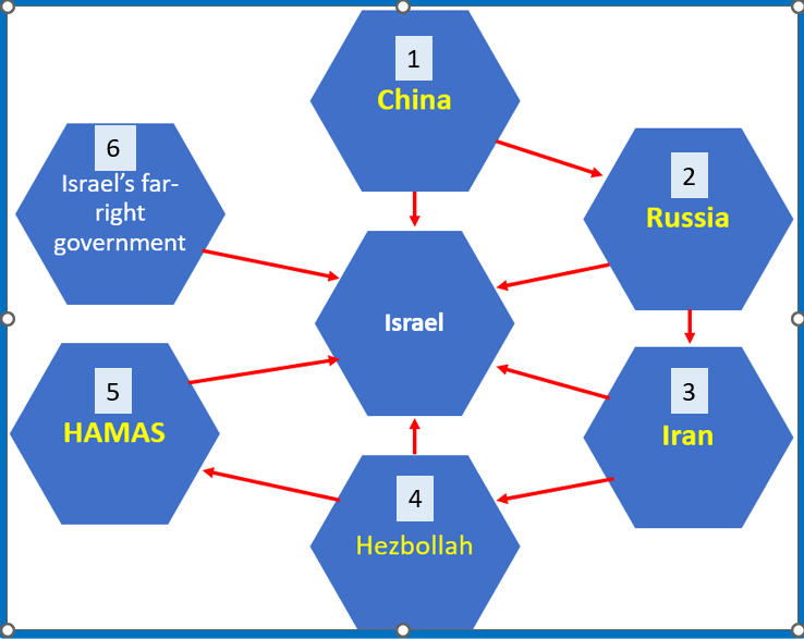 The others are Hamas, Hezbollah (both FTOs), Iran, their master, Russia, Iran’s master and overall, China’s influence, even tangentially over them all.