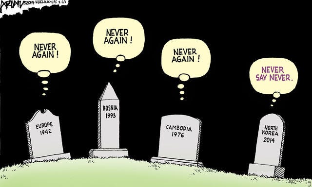 Even the UN whose forum I respect, has been relatively useless in diminishing what we said would be, “never again,” post WWII. In 2005, the UN adopted the RtoP or ROP depending on whose interpretation you read. ROP is the “Responsibility to Protect.”