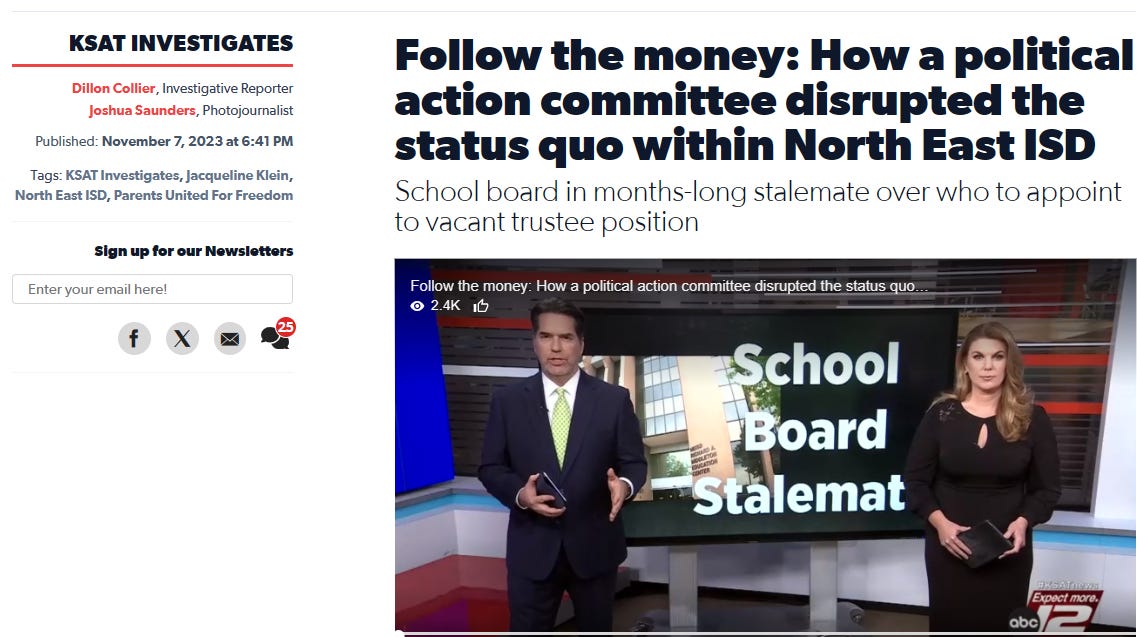 SAN ANTONIO – Late last month, North East Independent School District’s fractured board of trustees interviewed its top four candidates to replace the late Terri Williams as trustee for Single Member District 2. Williams passed away in August following a long illness. The battle to fill her seat has sent NEISD’s board into a tailspin, as trustees have squabbled in public meetings over who should fill Williams’ seat. Three of the trustees: Steve Hilliard, Marsha Landry and Diane Villarreal, have voiced their support for Jacqueline Klein, who lost to Williams in the May 2022 election by fewer than 75 votes" - Follow the money: How a political action committee disrupted the status quo within North East ISD - KSAT - Dillon Collier, Investigative Reporter - Joshua Saunders, Photojournalist