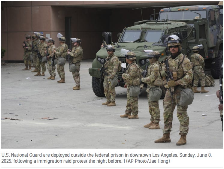 First, Trump has claimed that he is mobilizing the Cal Guard, over the objections of Gov. Newsom, because he claims that the protests rise to the level of “rebellion.” Rebellion is the legal threshold for him to employ Title 10 authorities. Most legal scholars believe this claim to be unsupportable. I would agree from a professional, national security perspective. Secondly, Title 10 authorities, do not allow for employing the Guard with arrest and law enforcement authorities. They will be there only to “protect” legitimate law enforcement personnel. Even many of the actions taken by existing ICE and other law enforcement entities, have come under serious legal scrutiny. Frankly, we are living under a mostly lawless Republican regime.