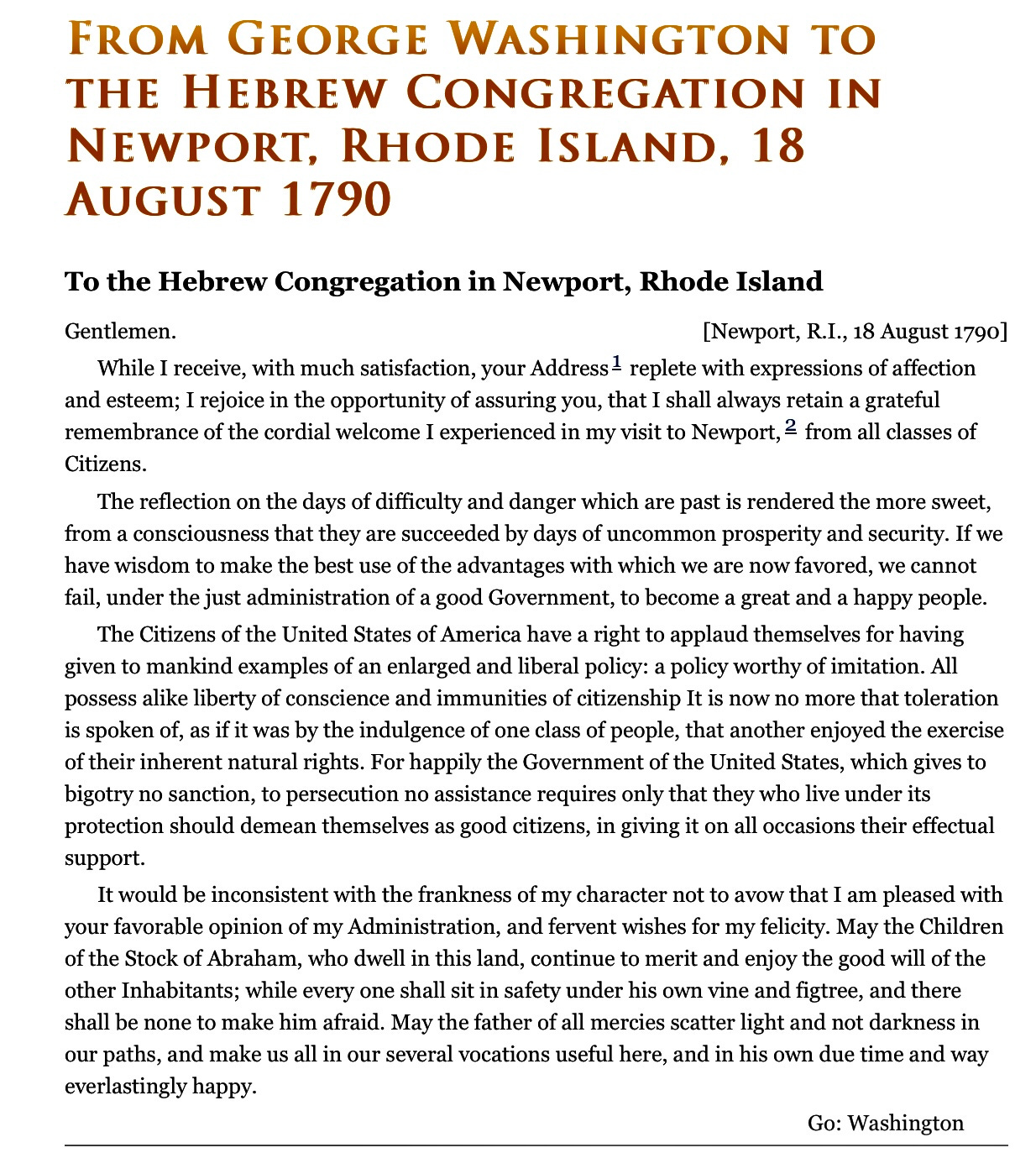 At the embedded link from the Library of Congress, we find insightful and critically important personal perspectives from Washington, Jefferson, Adams and Madison. Madison and Jefferson in particular were the driving force in ensuring that there would be no official role for religion in our constitution, other than guaranteeing that everyone would have the constitutional right to worship freely and with the system of religious beliefs, of their choice.
