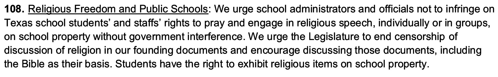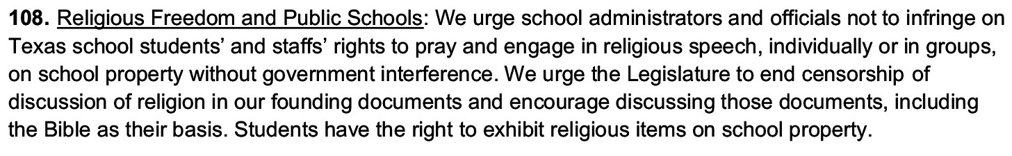 These three screenshots from the TX GOP Platform are just a small handful of overt assaults on the US Constitution regarding religion, but a close read of the full 49 pages shows a tightly woven, far-right extremism, not US nor TX constitutional principles. There are so many challenges to other, long-established constitutional principles that each will require a full paper, just like this one to explain. One of the worst and a personal injury to me, is their decades-long assault on public education. I’ve written on this before but will soon return to the topic.