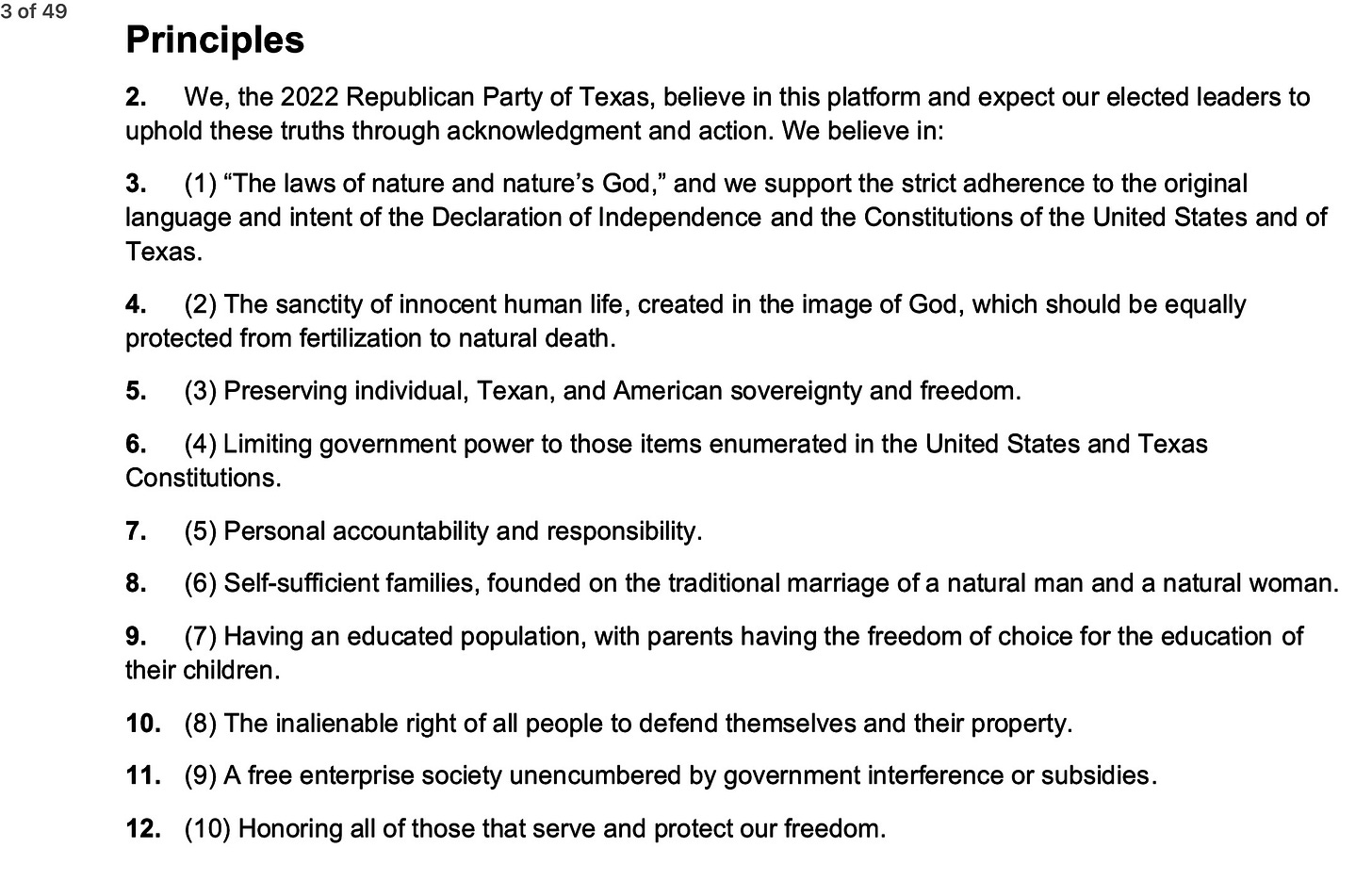 Under the section labeled Principles, numbers, 4 and 8 are explicitly religious values and have no role to play in either the Texas or US constitution.