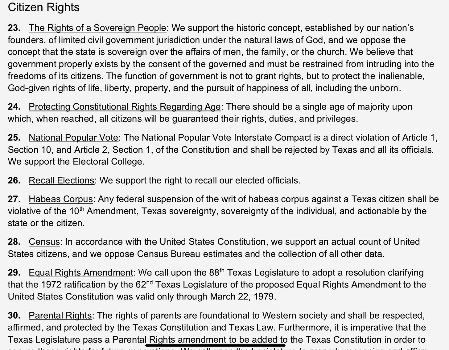 In the section titled, “Citizens’ Rights,” numbers 23 and 29 are easily interpreted as religious beliefs being imposed on the constitutional rights of all Americans.