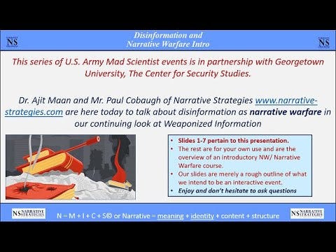 3. Understanding the core principles of narrative (not the lay terminology of a “story”) is the core of human influence operations. Still, the community at large refuses to adopt a professional understanding of this. Full disclosure, I am the vice-president of a US-based think/ do tank called Narrative Strategies where we teach, mentor and research human influence from an academic and operational perspective.