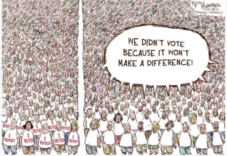 I know its a controversial topic for Americans, but here in Australia we have compulsory voting. Americans claim that infringes on the 1st Amendment rights - well TAT has just clearly explained what happens with that - you end up with, conservatively, a third of the population not voting, so you end up with a government in power who isn't really the choice of the majority of the population. With compulsory voting, where you can be fined for NOT voting, you have a true representation of the people's will. Yes there are ways to protest vote if you don't like being MADE to vote, or if you don't like any of the candidates, but ultimately you have a true representation of which government you want to be in power. And we're not 2 party ruled either - some of the voting papers for the Senate (aka the US House) are all metre or more wide because there are so many parties, some of them quite ridiculous, but with preferential voting, which is where if you don't make the "cut" you can determine who your votes go to, as do they etc etc until you have a candidate with the most votes. And every vote is equal - non of this electoral college crap where the winner isn't always the person who wins the popular vote. So you end up with a result that accounts for approximately 90% of the population, with each vote equal. There are those that argue "some people are too dumb to vote", or "you should only vote if you're involved in politics and informed of the issues", but you sure as hell don't end up with a government that only a small part of the population voted for and end up in the shit the US is in. Compulsory voting has its flaws and it's critics, but ultimately it MAKES people take notice of what's going on. Oh, and voting is always on a Saturday so you don't have to take time off work to vote and of course WE HAVE MAIL IN VOTING.