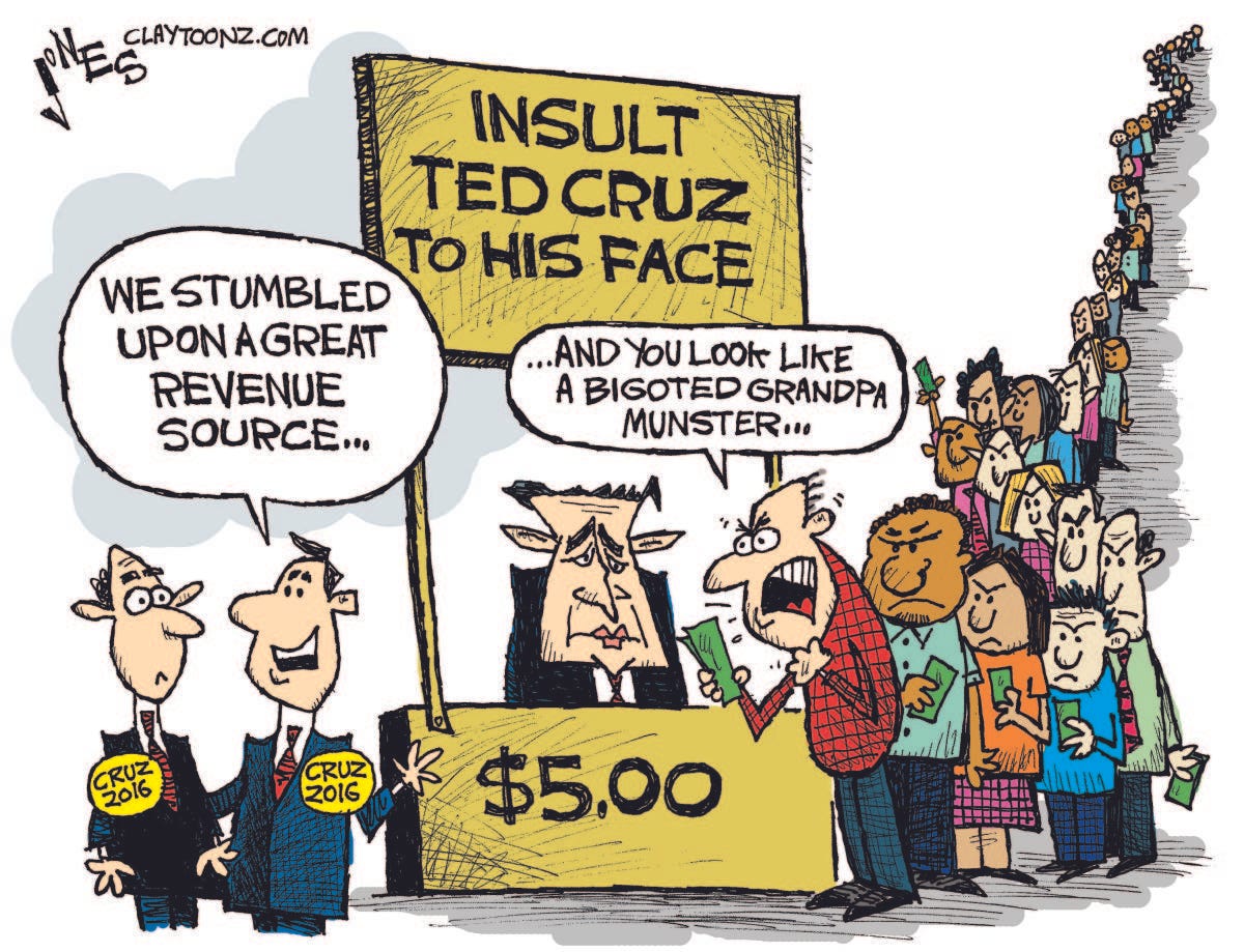 Ted’s campaign commercials that assault the senses on our TV, are laughable were they not so dangerous. They focus on extreme and utterly dishonest right wing culture war, conspiracy theories. The most prominent is to campaign on the accusations of his opponent allow men in women’s bathrooms and other gender related MAGA culture issues. He is literally, talking down to Texans who he must believe are ignorant. He spends his entire political career whining and moaning about calamitous issues but when push comes to shove, he defaults to conspiracy theories. This is because, his record of doing something, anything at all for Americans and Texans, is a blank sheet of paper.