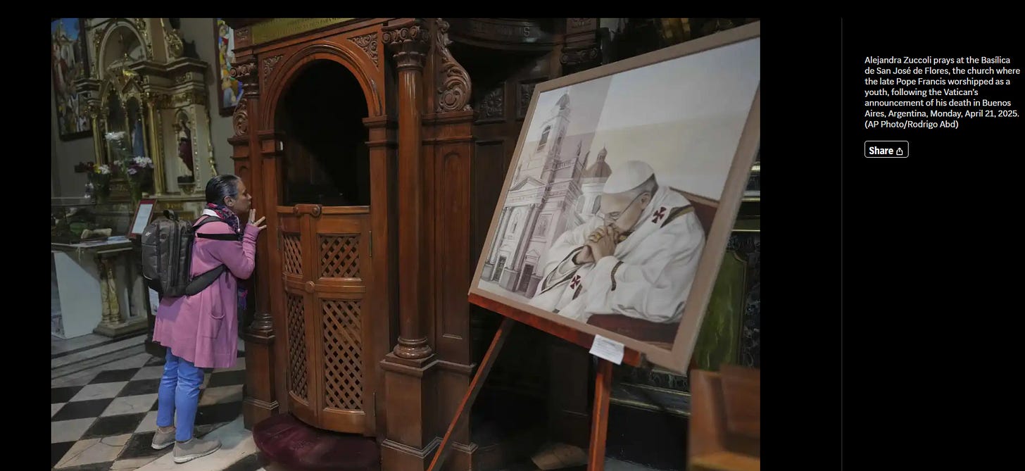 Good morning and I hope that everyone’s Easter and the other Spring holidays of so many religions, were thoroughly enjoyed and were appropriately enriching, in the past few weeks. Today, after the most important day for Christians and Catholics, we have lost the one Pope of my lifetime, that I believed emulated the life and preachings of Jesus so earnestly. Eschewing the opulence of Papal quarters, his Vatican life was as it had always been, with his flock are rarely the elite of the world. His life was remarkable in every respect and varied, but never once deviated from his passion for loving and serving, marginalized communities. In a world where people consistently ask, WWJD or the phrase, “What would Jesus do,” Papa Francisco, answered with how he lived his life, not just words.