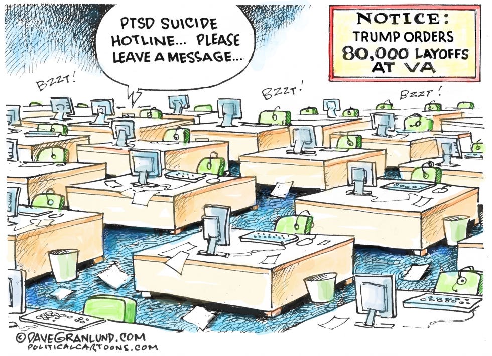 Today’s rallies and protests are against the proposed loss of 80,000 VA jobs, often filled by Veterans themselves. The other DOGE cuts have not just sent ripples through the VA but tsunamis. Their uninformed cuts have had direct impacts on access to care, some potential life-saving. due to the ensuing chaos and wait time increases. This has put enormous pressure on VA staff to accommodate our needs. While that remaining employees are working valiantly to support us, there is so much that they can do.