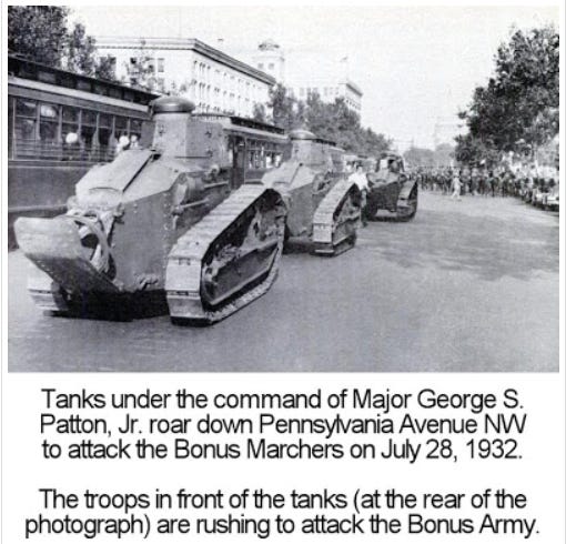 Led by MacArthur and then Major George Patton, 600 troops, six light tanks and mounted cavalry with drawn sabers accompanied by infantry, brutally cleared the Veteran camps around downtown Washington. July 28th of 1932, became another day that “will live in infamy.” Cast against the backdrop of the Great Depression, starving and jobless veterans being brutally routed from their camps while asking for assistance, was too much for a desperate nation, in the throes of our historically worst depression.