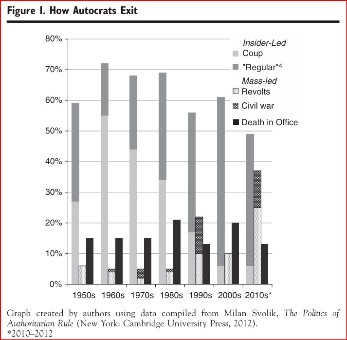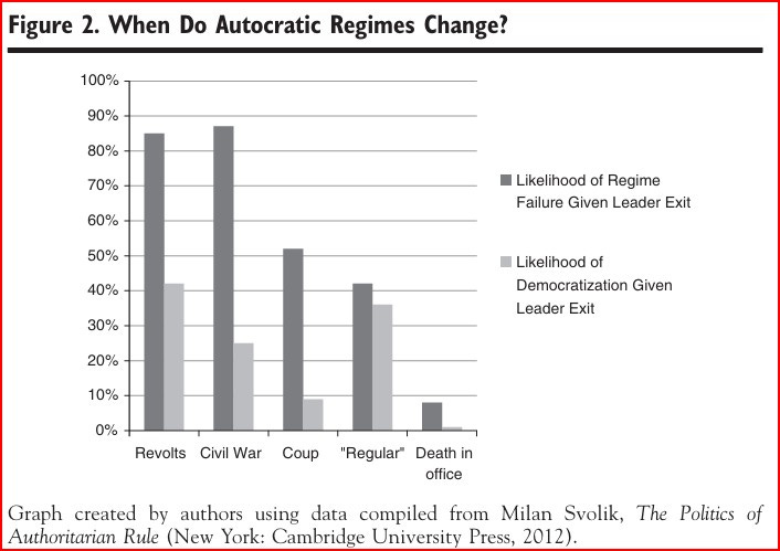 "The rise in the proportion of autocrats exiting office amid protests and decrease in those ousted by coups is particularly important because the way a leader exits office influences the subsequent political trajectory of a country. Specifically, it affects both the likelihood that the regime falls with the leader, and the chances that democratization will ensue." - How Autocracies Fall - Andrea Kendall-Taylor and Erica Frantz - THE WASHINGTON QUARTERLY - Spring 2014