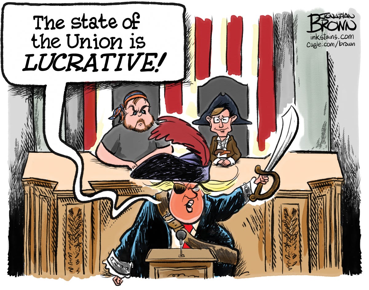 My approach to last night’s SOTU was to only watch long enough to assess Trump’s cognitive and physical capabilities. For the rest, I followed the Associated Press’ steady stream of updates throughout. Frankly, ten minutes was nine too many. On a scale of 1 - 10, with 10 being fully capable, I rate his cognitive health roughly a three, and his physical, possibly a four. What I saw was an old bloated man leaning heavily on the podium, which he consistently leaned far over while squinting, just to read the teleprompters. Talk about “low energy.”