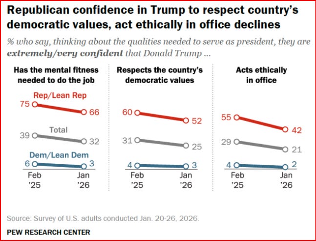 Even among Republicans, there is a noticeable decline in their confidence regarding his mental fitness, his respect for our democratic values and his ability to act ethically.