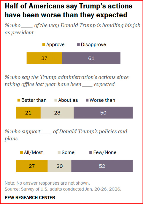 Trump’s speech fell flat for the all important independent voters, where his approval rating has dropped to an abysmal 20%. Republicans may have applauded on cue but there was little enthusiasm. Most felt as if Trump gave them absolutely nothing to work with, as the midterms beckon them tauntingly. In fact, in a late January poll from the esteemed, Pew Research Center shows how far Trump has dropped in favor across a wide variety of the electorate.