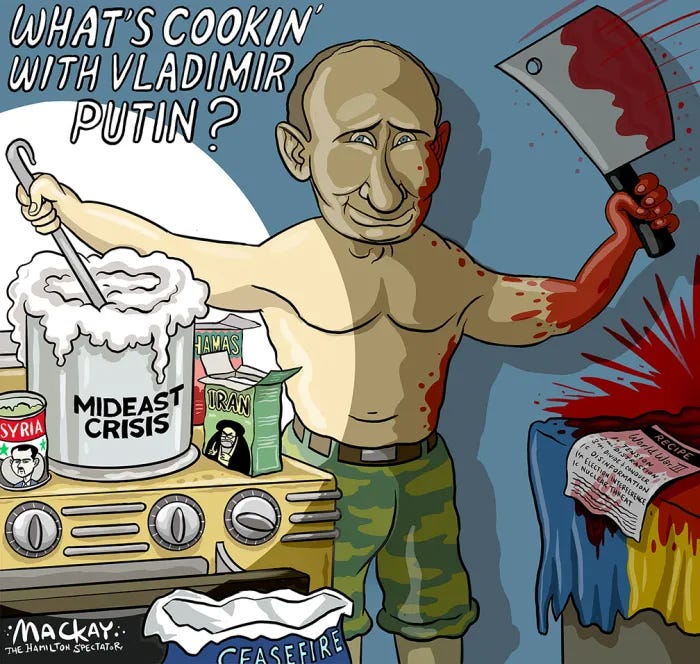 In many respects, I believe that the attack on Israel satisfied the entire hierarchy of bad guys, hence was encouraged at the time it occurred by those at the top, such as Xi and Putin. In early October, Putin was performing miserably in Ukraine. He had already begun his diversions in Armenia, Niger, Central Africa, the Balkans etc. At that time and before the Republican Party in Congress had refused to fund our allies in Ukraine, Putin needed diversions and for the nations that supply arms and other aid to Ukraine. Putin wished to take media scrutiny off of his dramatic failures and wished for NATO to expend their stockpiles and attention, helping Israel. This I believe is what led to such an overwhelming and barbaric attack. The October 7th attack, had to be large enough and heinous enough, to prompt the response that Hamas got from the IDF and most Western media. Ninety percent of Western media took the bait and began promoting Hamas propaganda regarding casualties rather than telling the West, the truth.