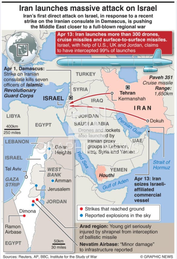 A couple of weeks ago, Bibi, Prime Minister Netanyahu and his extreme, right-wing government made a fateful and poor decision to attack an Iranian Consulate in southern Syria, where Iran has outposts, training and operational advisors, etc. Israel bombed the sovereign territory of Iran, by attacking the consulate. Consulates and Embassies are considered the sovereign soil of their resident nation. This required a response from Iran. The rest as they say, is now history.