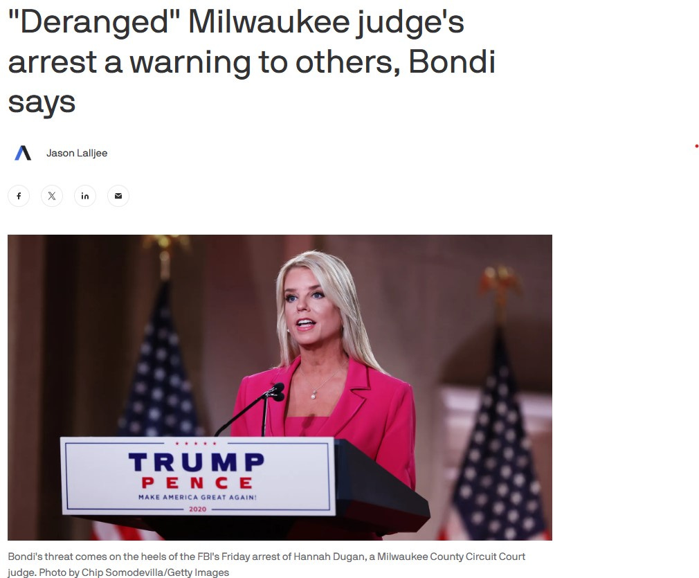 Attorney General Pam Bondi promised on Friday prosecution for judiciary members who cross the Trump administration. - "Deranged" Milwaukee judge's arrest a warning to others, Bondi says - Axios - Jason Lalljee - 04/ 25/ 2025