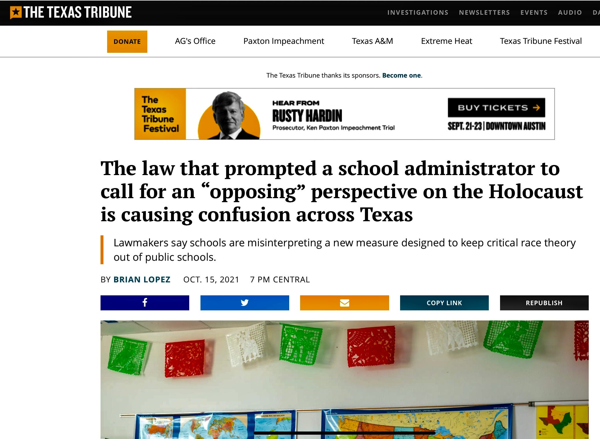 Here in TX and elsewhere, the far-right MAGA-controlled ideology of today’s GOP, is attempting to replace professionally designed curriculum with their own violent, right-wing extremist ideology, that underpinned January 6th. I will not stand still for this and am hoping that others will also stand up for true American, constitutional principles, rather than the fake patriotism of Christian White Nationalism.