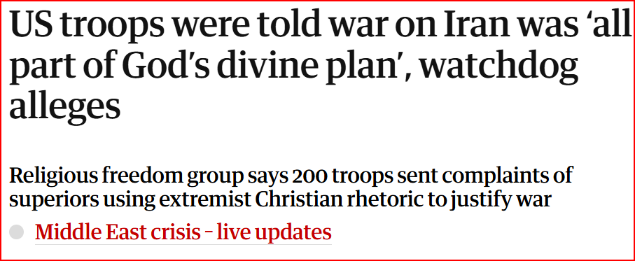 "Religious freedom group says 200 troops sent complaints of superiors using extremist Christian rhetoric to justify war US military commanders have been invoking extremist Christian rhetoric about biblical “end times” to justify involvement in the Iran war to troops, according to complaints made to a watchdog group. The Military Religious Freedom Foundation (MRFF) says it has received more than 200 complaints from service members across all branches of the armed forces, including the marines, air force and space force. One complainant, identified as a noncommissioned officer (NCO) in a unit that could be deployed “at any moment to join” operations against Iran, told MRFF in a complaint viewed by the Guardian that their commander had “urged us to tell our troops that this was ‘all part of God’s divine plan’ and he specifically referenced numerous citations out of the Book of Revelation referring to Armageddon and the imminent return of Jesus Christ”. - US troops were told war on Iran was ‘all part of God’s divine plan’, watchdog alleges - The Guardian - Sara Braun - Tue 3 Mar 2026 16.21 EST