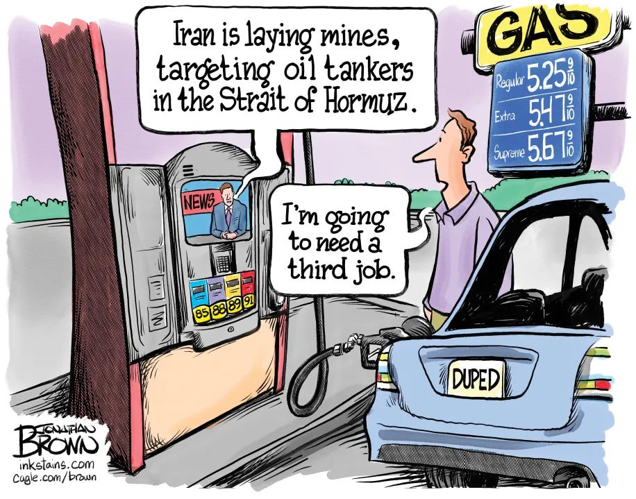 First and foremost, thank you for your patience these past few days while I took a short break. An opportunity arose for me to spend these days with my grandchildren who live far away. With our airlines operating far below any level of real dependability, I made this visit a road trip. The truth is, I was raised with and still find time alone on the road not only peaceful, but useful for pondering serious issues, such as the myriad of acute threats facing our nation and in fact, our world. In many ways, what I experienced on the road became the inspiration for today’s essay, the 8th in a series about the administration’s ill-conceived war with Iran. The focus today is the deep impact that this war, compounded by a year and a half, of criminal mismanagement of our government, has had on the day-to-day lives of all Americans.