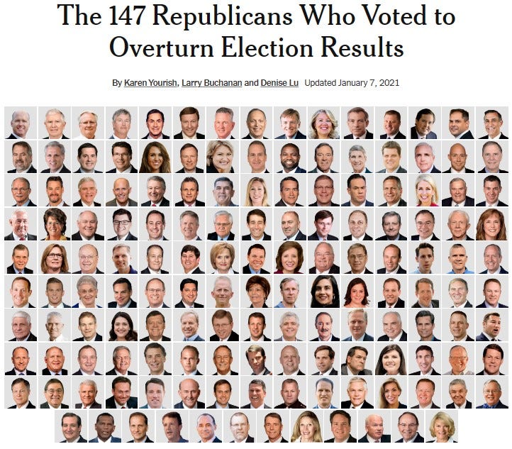 Not one of the sitting GOP congressmen audibly condemn the armed insurrection organized and perpetrated by a sitting POTUS. By default, this violates their oath of office. Many GOP congressmen actually participated in or enabled the rebellion, including my own Jr. Senator, whose Seditious devotion directly supported and in my professional opinion, helped to incite the rebellion. The only two courageous GOP congressmen are now no longer in office for being honest. That is former representatives, Cheney and Kinzinger.