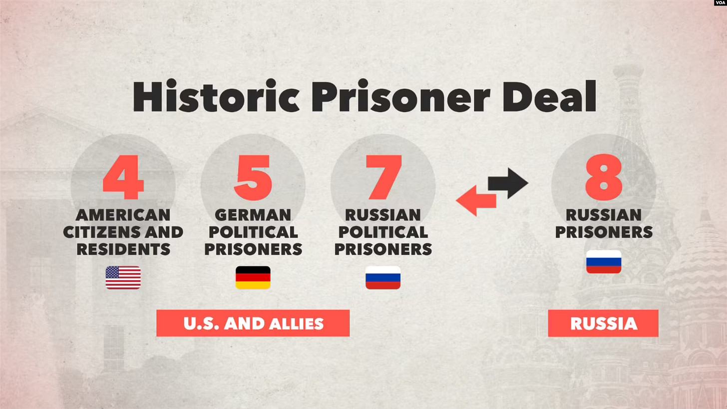 Russia, Belarus, the US, Germany, Poland, Slovenia, Turkey, and Norway conducted a high-profile prisoner exchange involving 26 prisoners from multiple countries on August 1. Turkey mediated the 26-prisoner swap, which took place in Ankara.[30] US officials confirmed the release of three US citizens — retired US Marine Paul Whelan, Wall Street Journal (WSJ) journalist Evan Gershkovich, and Radio Free Europe/Radio Liberty (RFE/RL) journalist Alsu Kurmasheva — seven Russian political prisoners, including Russian opposition politician Vladimir Kara-Murza — four German citizens from Russian detention — and one German citizen from Belarusian detention.[31] Russian President Vladimir Putin signed pardons for the 15 individuals released from Russian detention, and Belarusian President Alexander Lukashenko signed a pardon for the German individual released from Belarusian detention.[32] The US, Germany, Poland, Norway, and Slovenia released eight imprisoned Russian nationals, including Russian Federal Security Service (FSB) contract killer Vadim Krasikov, Russian intelligence agents Artem and Anna Dultsev, Russian General Staff's Main Directorate (GRU) agent Pavel Rubtsov, hacker Roman Seleznev, and businessman Vladislav Klyushin, and also returned two minors (reportedly the children of two of the released Russians).[33] Putin met the returned Russian prisoners on the tarmac at Vnukovo-2 airport in Moscow and stated that he is nominating them for state awards.[34] - ISW Ukraine War updates, Aug. 1 - ISW Institute for the study of War - 02 Aug 2024