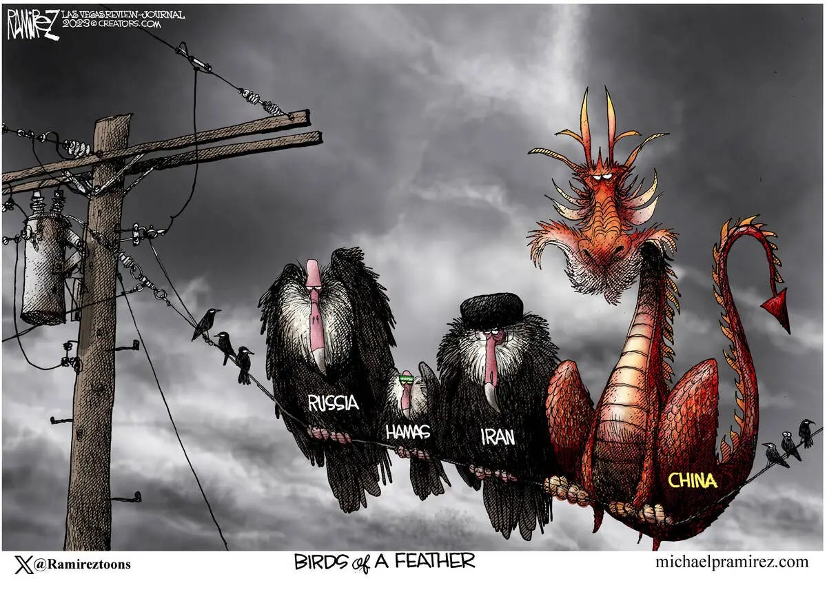 Now that Gaza is less of a main focal point for news media, the prominence of Iran in causing this war is coming more into focus. This is also the link to discussing Putin and Xi, in the last section. Iran has significant importance to both Putin and Xi, Putin in particular. Iran’s enormous support to Hamas and Hezbollah is much of the reason that Hamas was empowered to start this war with Israel in the first place. It provides Putin a global diversion from his failures in Ukraine and Iran has no choice but to provide support. She depends on Russia and China for support and commercial reasons, including Xi’s China Dream/ BRI policies.