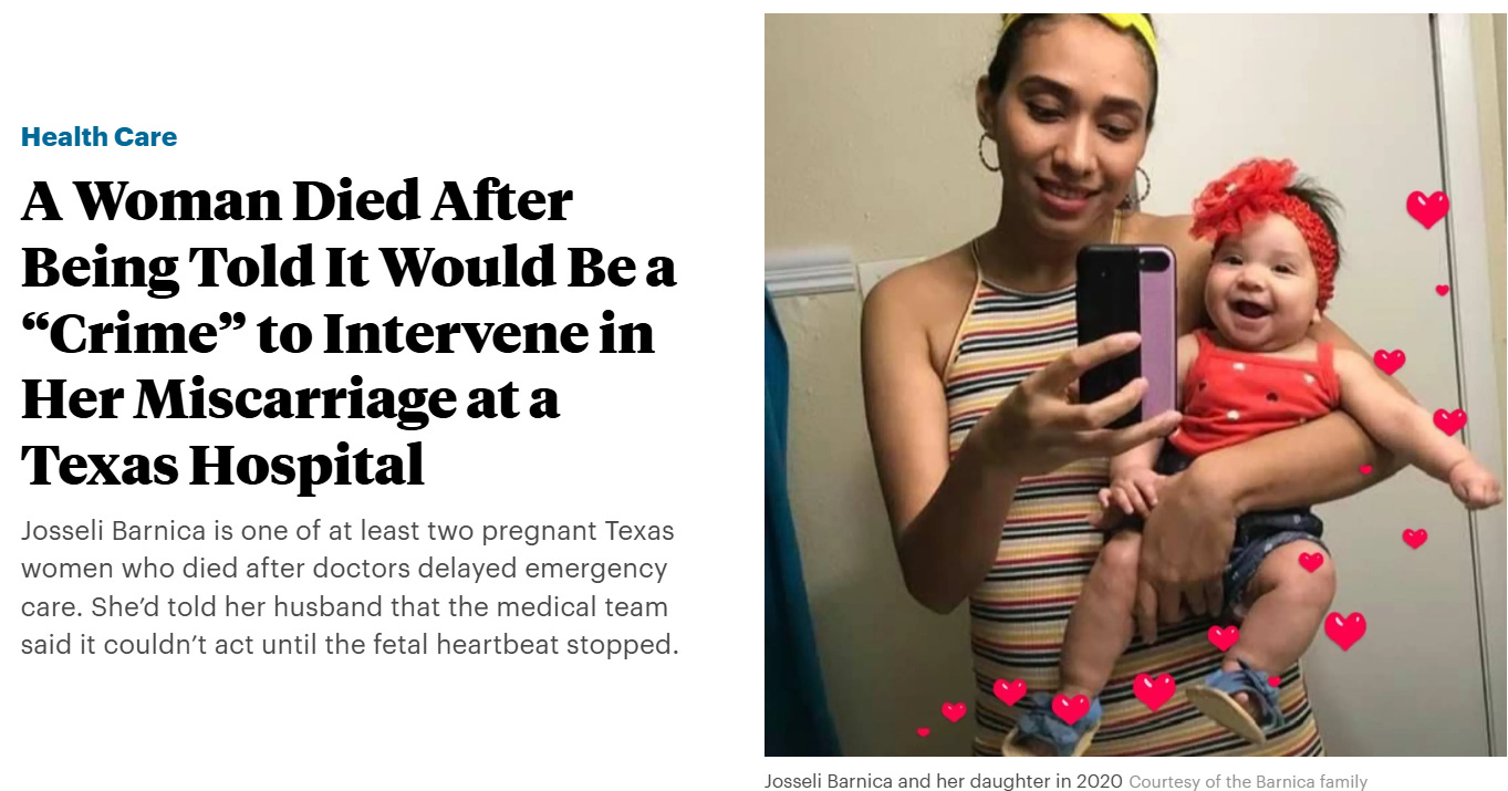 As long-time readers know, I quite often write about Texas as a way to illustrate to other citizens around the nation, just what MAGA governance looks like, and it’s getting worse by the day. If you live in a deep red state, you already understand the un-American MAGA ideology that governs you and what it means in your everyday life. For those living in blue states, the daily headlines in Texas papers often look like something from a dystopian novel, but tragically, it is all too real. When I read stories like this morning’s about Josseli Barnica, I realize that here in TX and states like Florida, Georgia and several others, being a woman doesn’t only come with a deadly risk, but countless other risks and hardships, including the denial of basic human rights and healthcare.