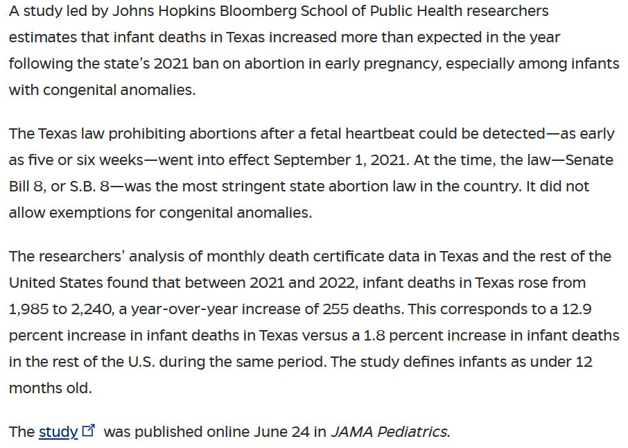 It is not just the mother’s health that is at stake in draconian states like Texas. In a research project by Johns Hopkins Bloomberg School of Public Health conducted for the first year after Texas passed SB8, infant deaths also increased at roughly 10 times the national rate.