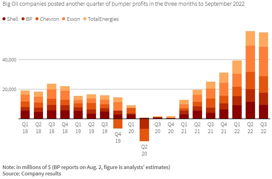 So, with only two quarterly exceptions since 2018, big oil has posted huge profits and often record profits. Before the last election, they sided with Putin, OPEC+ and the MAGA wing of the Republican party to push high prices at the pump in order to keep the party most lenient in regulatory controls, in power. Yep, Big Oil and their Wall Street investors wielded the cost of gas as a weapon to acquire more record quarterly profits at the expense of working Americans. This is a trend in most major industries as well. Remember all of that GOP hype, pre-midterms about inflation? The truth is, that inflation was only part of the story. Profiteering by major retailers was part of the problem too, not just very real inflation caused by a global pandemic.