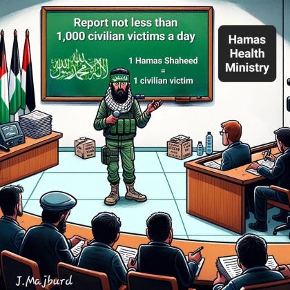 This morning, in the Times of Israel, a preferable source for Israeli news, you will get a great deal of detail that is mostly missing from western reporting. For those unfamiliar with Israel, it would be nearly impossible to navigate to a comprehensive understanding of the situation, based on western reporting. Some of my formerly recommended sources like Reuters and the BBC have been so dishonest in their reporting about the war that I would fairly judge them antisemitic. Daily they blast out casualty figures from the “Hamas run Health Ministry,” a longtime and well-known Hamas propaganda sources. Not only are the figures inaccurate, but they are echoed by the UN and most western media without challenge.
