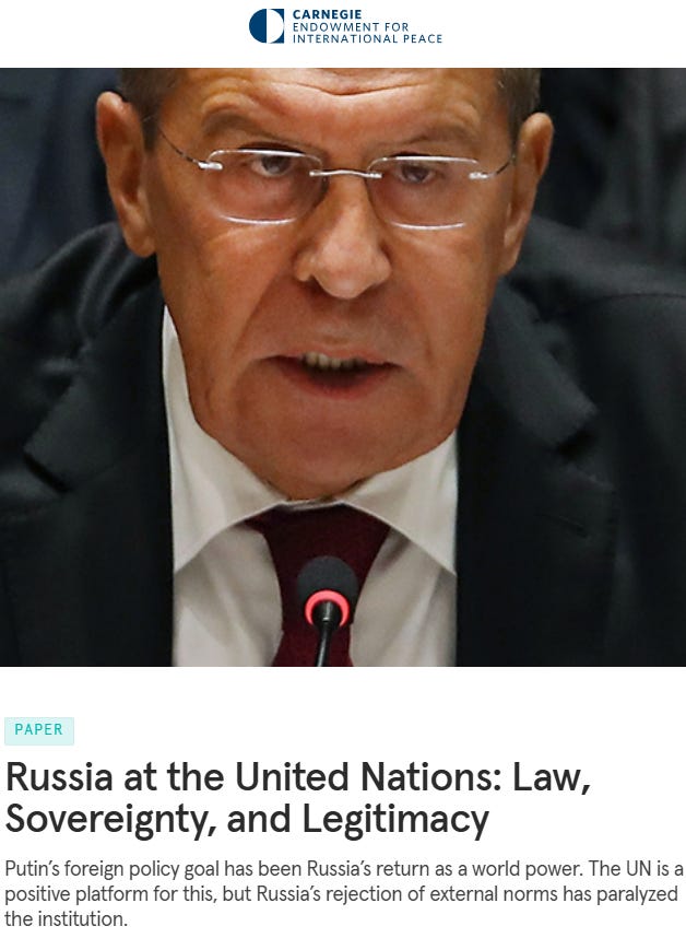 Russia’s participation in the UN is governed by an interlocking series of concepts, starting with Russia’s definition of international law, narrowly based on the UN Charter and Security Council resolutions, as opposed to a “rules-based order” that Russia defines as expansive and promoting the interests of Western powers. This division enables Russia to reject on principle commitments regarding human rights and democratic governance. A second concept, multipolarity, asserts that an oligarchic group of states must take collective action on the basis of equality and consensus. At the UN, this plays out among the permanent members of the UNSC as an alliance with China against Western interests. The concept of a multipolar oligarchy leads to the Russian concept that true sovereignty is possessed by only a few great powers; the sovereignty of states it views as dependent on great powers is limited. The territory of true sovereigns and those states under Russian protection is sacrosanct and can be defended by force; for the others, it is impermissible to regain territory that is “in dispute” by force. As an example of the former, consider the lengths to which Russia has gone to protect Syria’s use of armed force against its own population, whereas the sovereignty of former Soviet states such as Azerbaijan, Moldova, Georgia, and Ukraine must be negotiated. - Russia at the United Nations: Law, Sovereignty, and Legitimacy - Carnegie Endowment for International Peace - by Philip Remler - Published on January 22, 2020