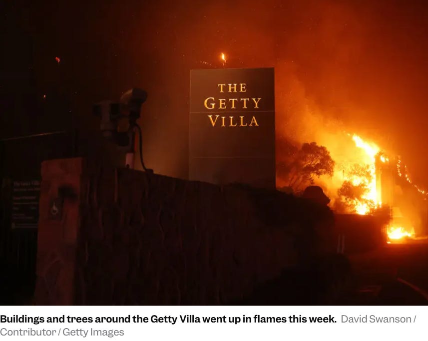 Last Tuesday, fires first popped up around Pacific Palisades, one of the nation’s most beautiful neighborhoods and small cities. Like most of LA, the only thing separating these small communities from their adjacent cities and communities, is the width of a city street. On one side of the Palisades, as it is called locally is Santa Monica. Continue up Sunset Blvd. from the Beach and there’s the part of Brentwood made famous with OJ’s murder of Nicole Brown Simpson and Ron Goldman. Head west and its unincorporated space north of the Pacific Coast Highway on towards the city of Malibu. At the end of Sunset is the original Getty Museum, referred to as the “Getty Villa.” a few miles inland and near the top of the mountains between the San Fernando Valley and downtown LA, stands the spectacular and gleaming new Getty Museum.