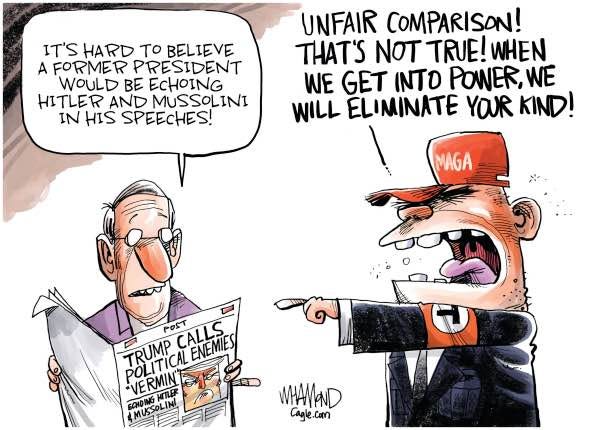 This is the type of material that populates nearly every MAGA campaign product. The demonization of opponents, humiliation and abuse heaped onto minority populations, political opponents and threats of violence against anyone without a zombie-like devotion to Trump and MAGA ideology. These features are a literal playbook from how Nazi, Germany ran their campaigns.